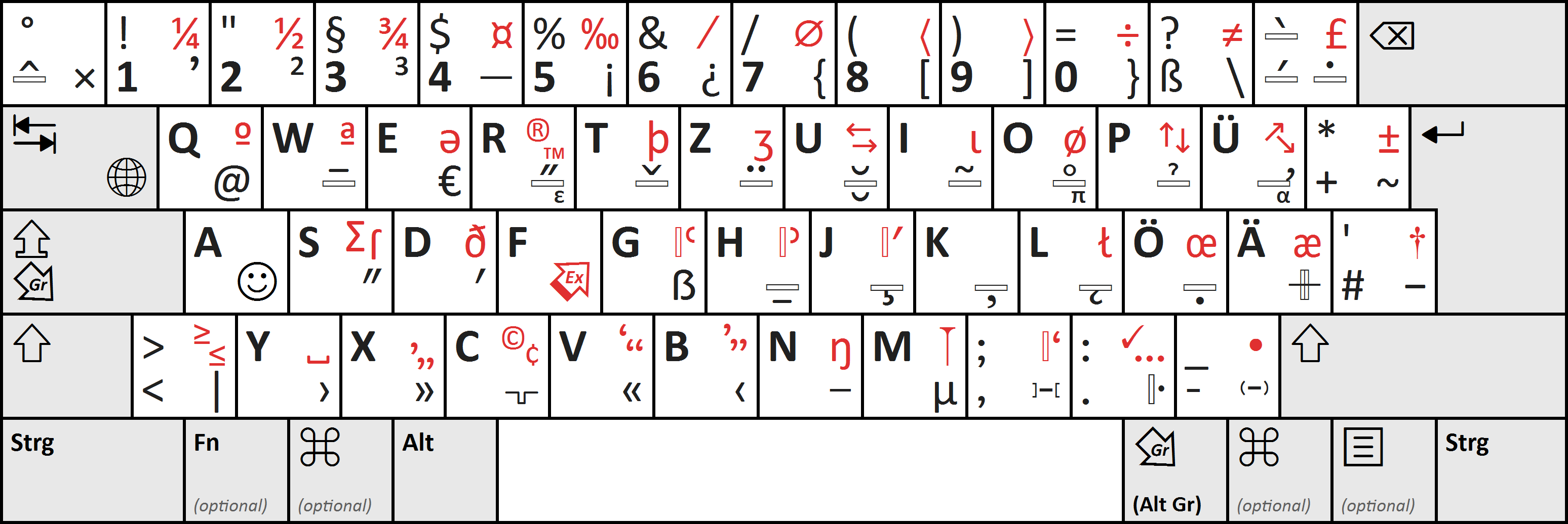 Ausführliche Information finden Sie im Wikipedia-Artikel „E1 (Tastaturbelegung)“.